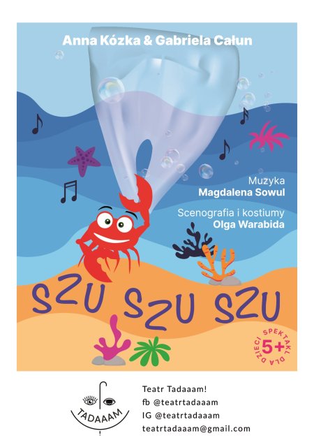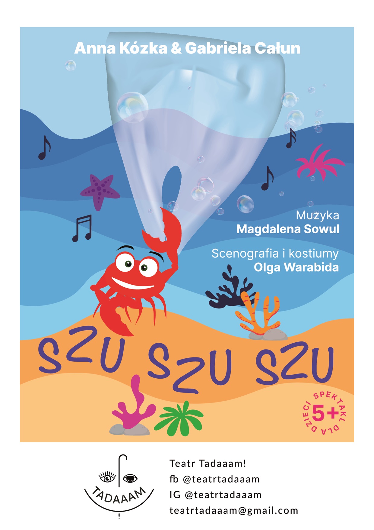 SZU SZU SZU to pełen humoru i muzyki spektakl dla dzieci o podmorskich przygodach Kraba Skorupki. Spektakl sprytnie łączy w sobie ważne tematy, jakimi są troska o los zwierząt i stan przyrody oraz niełatwy temat, jakim jest mierzenie się ze swoimi lękami w walce o marzenia. Jednocześnie opowiedziany jest w lekki, zabawny i atrakcyjny dla dzieci sposób.