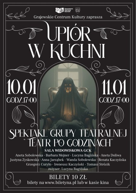 Komedia z dreszczykiem, w której „duchy” mają całkiem sporo wyrachowania, a każdy kolejny zwrot akcji zaskakuje bardziej niż poprzedni. Spektakl w wykonaniu "TEATRU PO GODZINACH" występującego pod egidą Grajewskiego Centrum Kultury. Możecie Państwo liczyć na sporą dawkę tajemnicy i fantastyczną grę aktorską naszych lokalnych artystów.