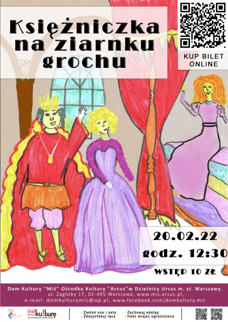 Baśń „O księżniczce na ziarnku grochu” pozwala przenieść się w świat zapomnianych arystokratycznych rytuałów. Dzieci spotykają Królewską Rodzinę i poznają zasady dworskiego ceremoniału. Dzięki wyobraźni wraz z rodzicami i aktorkami odkrywają bajkę. Nawiązując do etykiety dworskiej szukamy odpowiedzi na to, jakie wymagania stawiano dawniej przed księżniczkami i królewiczami. Co odróżniało prawdziwą księżniczkę od tej nieprawdziwej? Słowo, wyobraźnia, lalka, piosenki i muzyka otworzą świat i morał opowieści H.Ch. Andersena. „Czymże jest ziarnko grochu –szczęścia owego przyczyna?” Rekwizyty teatralne pobudzają wyobraźnię i pozwalają dzieciom aktywnie uczestniczyć w odgrywanych scenach baśni H. Ch. Andersena. Dzieci współtworzą wraz z aktorkami poszczególne sceny, nadając im kształt i wyraz artystyczny oraz uczą się poprzez sztukę teatralną. Poznają też nowe rodzaje komedii. „Bo tak w bajce jest jak w życiu, miłość czeka gdzieś w ukryciu. Bo tak w życiu jest jak w bajce, miłość zawsze Ciebie znajdzie”.