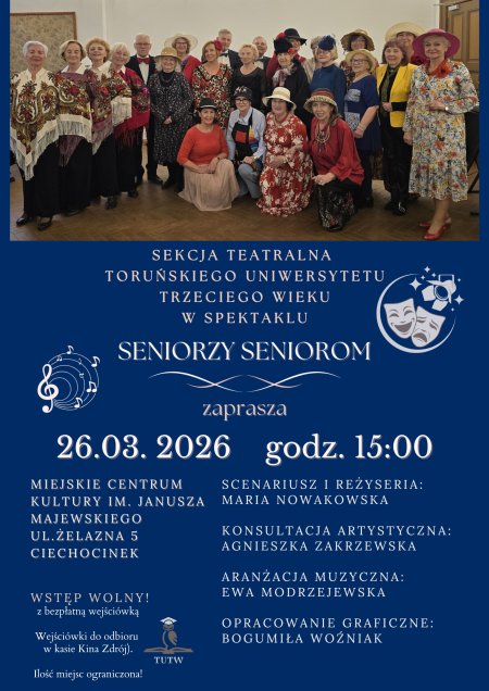 Miejskie Centrum Kultury zaprasza na wyjątkowe spotkanie z teatrem przygotowane przez Sekcję Teatralną Toruńskiego Uniwersytetu Trzeciego Wieku. Spektakl „Seniorzy Seniorom” to pełne humoru, muzyki i ciepła wydarzenie stworzone przez seniorów dla seniorów – i nie tylko.