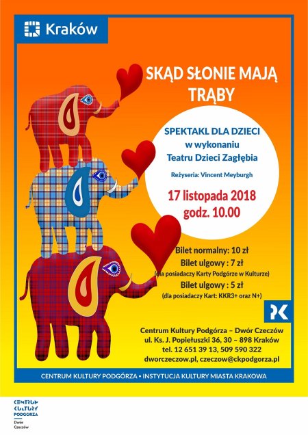 Zapraszamy serdecznie na listopadowy spektakl rodzinny pt. "Skąd słonie mają trąby?" w wykonaniu Teatru Dzieci Zagłębia im. Jana Dormana z Będzina. Spektakl odbędzie się 17 listopada o godzinie 10:00.
