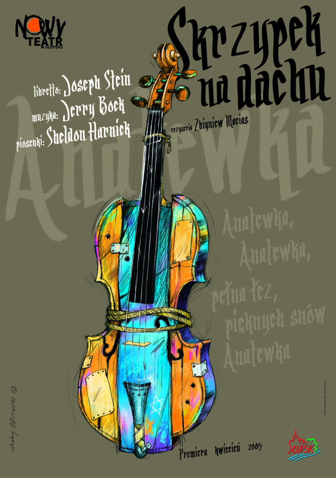 Słynny musical według libretta Josepha Steina opartego o powieść tworzącego w jidysz galicyjskiego pisarza Szolema Alejchema – „Tewie mleczarz”. Któż dziś nie zna słynnej, a przecież niemal „sztandarowej” piosenki tego musicalu: „Gdybym był bogaty” – niejako emanacji marzeń ubogiego mleczarza, ale i jednocześnie na pewien sposób filozofa – Tewiego, ojca pięciu córek, borykającego się z codziennymi problemami, a jednak pogodnego, wciąż dyskutującego z Bogiem na temat losu swojego, swoich najbliższych i bliźnich. Warstwę muzyczną „Skrzypka na dachu” stworzył Jerry Bock, a teksty piosenek – Sheldon Harnick.