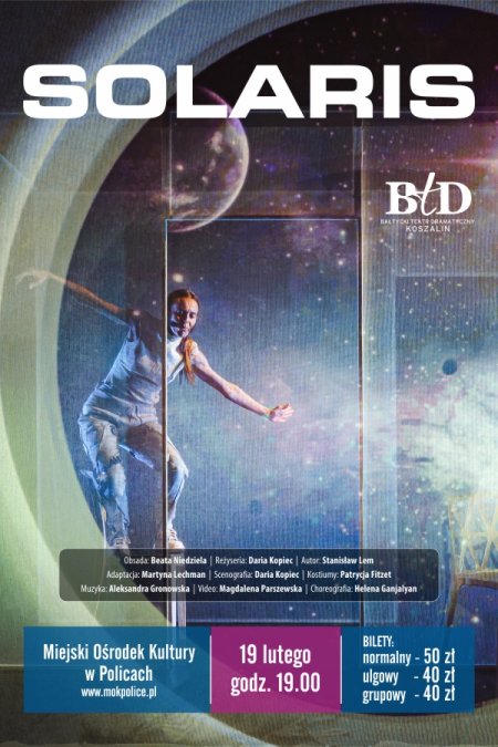 Solarystyczna opowieść Stanisława Lema została przełożona na język monodramu. Kelvin, główny bohater, ucieka przed życiem i relacjami w pracę. Jego największym celem, któremu poświęca wiele lat życia, jest dotarcie na planetę Solaris, której tajemnic dotąd nie odkryli badacze. Izolacja i poczucie wyobcowania, jakie towarzyszą jego pobytowi na stacji kosmicznej, stają się okazją do uzewnętrznienia się wewnętrznych rozterek głównego bohatera. Jego dotychczasowe postępowanie było próbą wyparcia samobójczej śmierci ukochanej. Dopiero nietypowe zdarzenia, jakie mają miejsce na stacji na Solaris, stwarzają mu nieoczekiwanie warunki do spotkania z samym sobą i uwolnienia od traumatycznego zdarzenia. Forma monodramu idealnie pokazuje, jak ważne dla nas osoby i zdarzenia są dosłowną częścią nas samych. Spektakl będzie metafizyczną podróżą bohatera w głąb siebie, szukając odpowiedzi nie tylko w materialnym świecie faktów i zdarzeń z życia bohatera, ale przede wszystkim wchodząc w głąb struktury naszej transcendentalnej natury.
