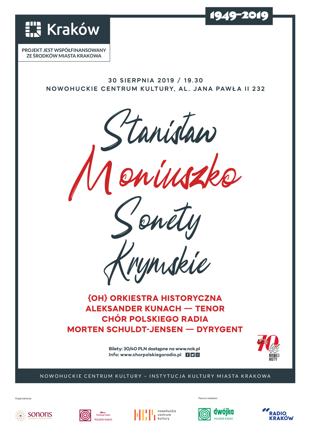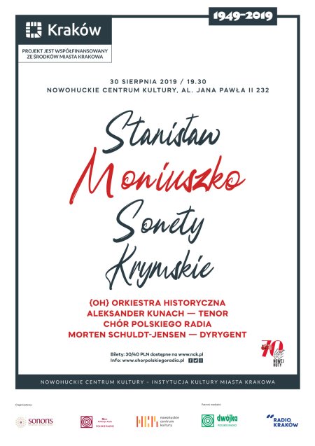 To właśnie dzieło Chór Polskiego Radia zamierza przypomnieć w roku, w którym świętujemy jubileusz 200. rocznicy urodzin Moniuszki. Wykonanie to będzie jednak niezwykłe. Do nowohuckiego koncertu zaproszona bowiem została grająca na instrumentach z epoki {OH} Orkiestra Historyczna, dzięki czemu napisane ponad 150 lat temu „Sonety krymskie” zyskają szczególny, historyczny wydźwięk. W roli solisty wystąpi znakomity tenor Aleksander Kunach. Całość poprowadzi ceniony dyrygent Dirk Vermeulen.