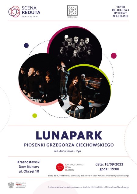 Krasnostawski Dom Kultury w ramach programu Scena Reduta zaprasza dnia 18 września 2022 r. o godz. 19:00 na spektakl „Lunapark” z piosenkami Grzegorza Ciechowskiego. Bilety w cenie 30 zł /40 zł w dniu spektaklu/ do nabycia w kasie KDK i na stronie www.bilety.krasnystaw.pl