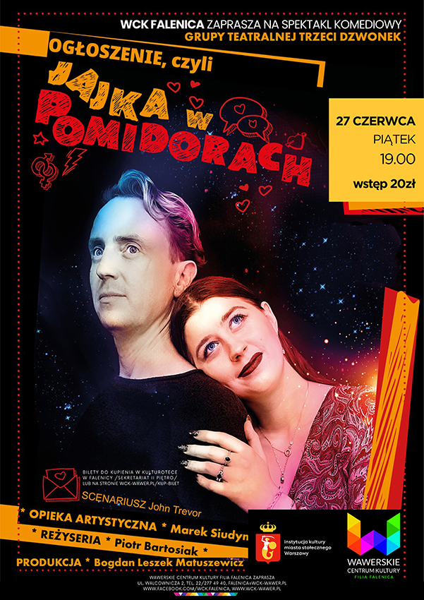 Zapraszamy na spektakl Grupy Teatralnej Trzeci Dzwonek „Ogłoszenie, czyli jajka w pomidorach" to komedia omyłek, pełna zwrotów akcji i humoru. Opowiada historię młodego pracownika korporacji, który przypadkiem poznaje córkę prezesa swojej firmy. Seria zabawnych wydarzeń prowadzi do niespodziewanego finału. Opiekę artystyczną nad spektaklem objął uznany aktor i reżyser Marek Siudym.