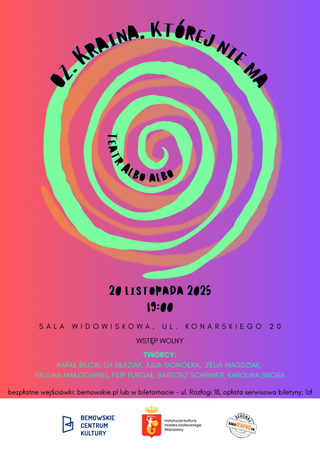"Oz. Kraina, której nie ma" to spektakl oparty na motywach "Czarnoksiężnika z Krainy Oz" L. Franka Bauma. To podróż po onirycznym świecie tajemniczego Oza, w którym rzeczywistość miesza się z fantazją. Przewodniczką po tym świecie jest Dorota poszukująca powrotu do domu - do tego, co znane i prawdziwe. Jej podróż jest jednocześnie zaproszeniem, aby zaakceptować własną historię i powrócić do domu. Bo "wszędzie dobrze, ale w domu najlepiej".