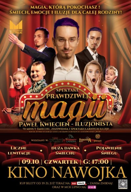 Przygotujcie się na 70 minut pełnych emocji, śmiechu i zaskoczeń. Paweł Kwiecień, iluzjonista, który na co dzień czaruje widzów po całej Polsce, zaprasza Was na show, które połączy magiczne iluzje z rodzinną atmosferą! To najśmieszniejsze magiczne show w Polsce - przeznaczone dla całych rodzin, które będą miały okazję poczuć się częścią tej niezwykłej przygody!