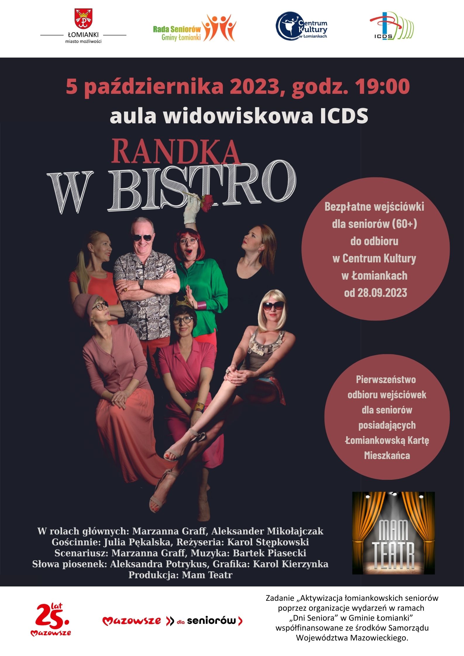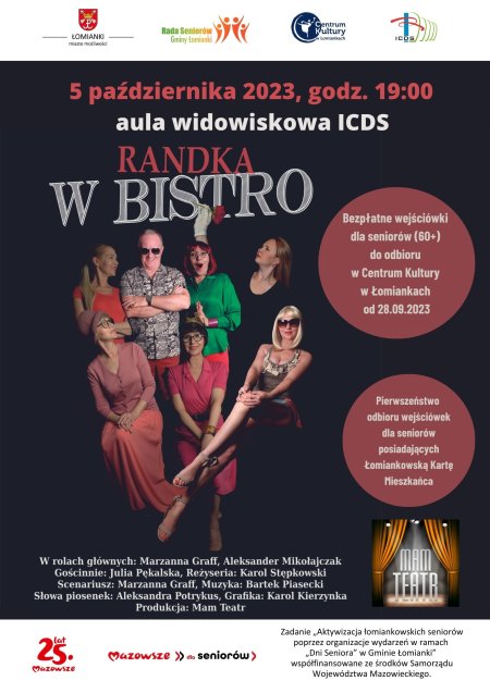 Rada Seniorów Gminy Łomianki zaprasza wszystkie osoby, które ukończyły 60 rok życia, na spektakl teatralny „Randka w Bistro”, który 5 października odbędzie się Integracyjnym Centrum Dydaktyczno-Sportowym w Łomiankach.