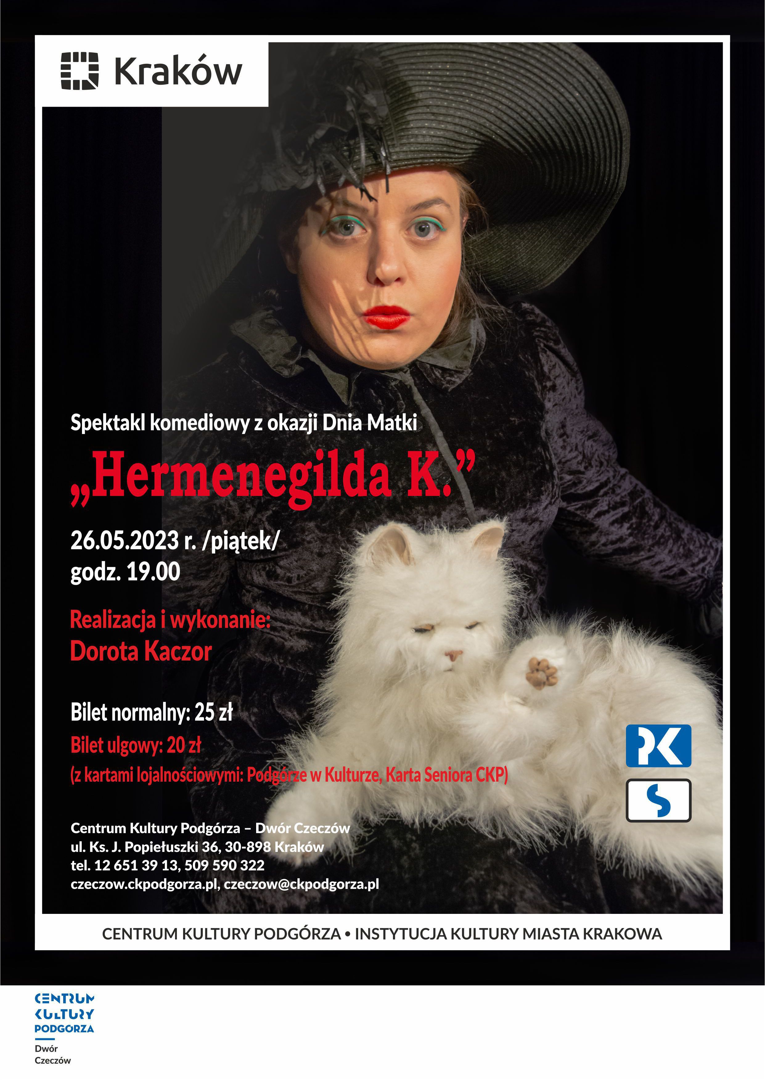 Zapraszamy na spektakl komediowy z okazji Dnia Matki pt. "Hermenegilda K.", który odbędzie się w piątek 26 maja 2023 r. o godz. 19.00 w Dworze Czeczów.