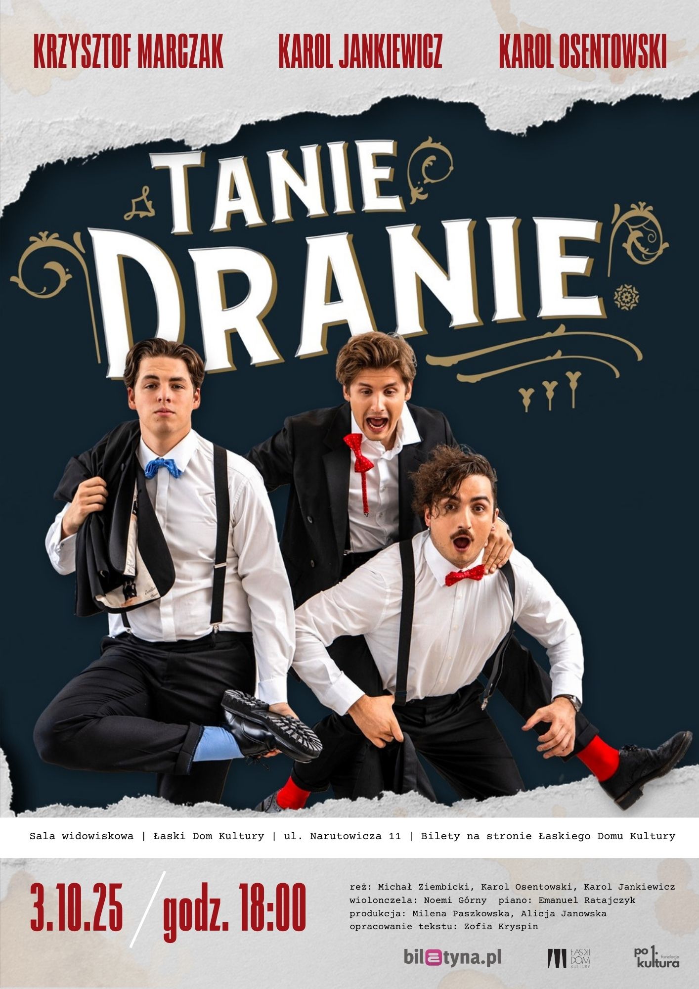 Tanie Dranie to spektakl muzyczny złożony z piosenek Kabaretu Starszych Panów (i nie tylko!), improwizacji, autorskiego scenariusza i gry aktorskiej. Powrócimy na chwilę pamięcią do Wieczorów Starszych Panów, minionego świata lat 50. i 60. XX wieku, choć nie zabraknie też nawiązań do współczesności.