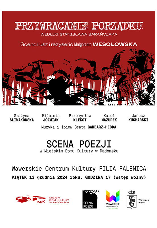 Zapraszamy na spektakl poetycki "Przywracanie porządku" w wykonaniu aktorów Sceny Poezji z Miejskiego Domu Kultury w Radomsku.