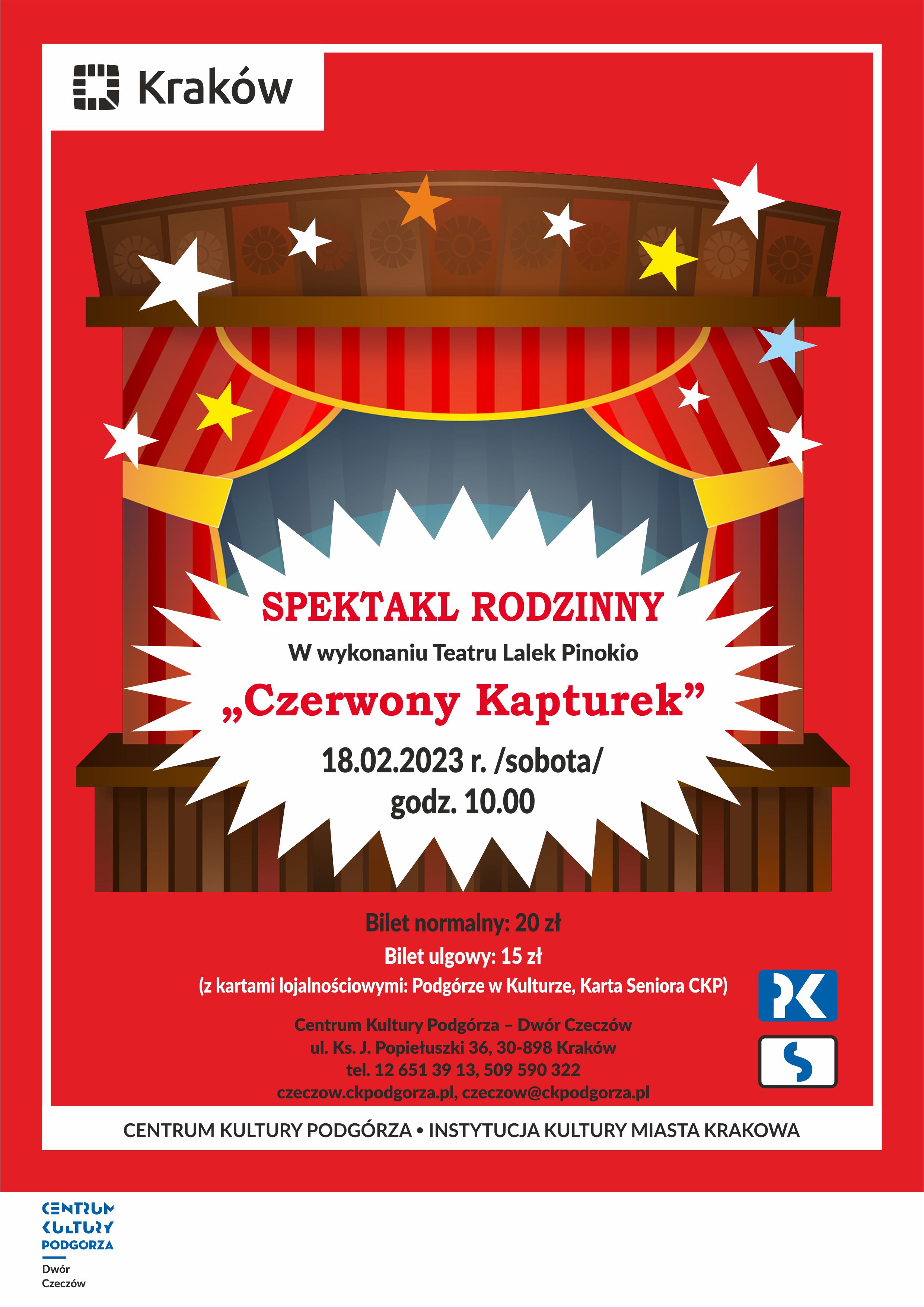 Zapraszamy na spektakl rodzinny pt. „Czerwony Kapturek” oraz na zabawę na koniec karnawału w wykonaniu Teatru Lalek Pinokio. Spektakl oraz zabawa odbędą się 18 lutego 2023 roku o godz. 10.00 w Dworze Czeczów.