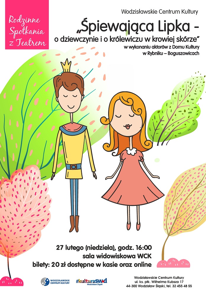 Baśń Słowian Zachodnich będzie tematem przewodnim „Rodzinnych spotkań z teatrem”, na które Wodzisławskie Centrum Kultury zaprasza w niedzielę, 27 lutego o godz. 16:00. Tym razem publiczność będzie mogła zobaczyć program w wykonaniu aktorów z Domu Kultury w Rybniku – Boguszowicach „Śpiewająca Lipka - o dziewczynie i o królewiczu w krowiej skórze”, na który złożą się prezentacje sceniczne i warsztaty artystyczne.