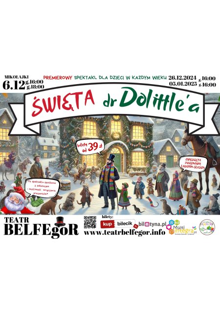 Twórcy poprzednich hitów, Cukierku, Ty Łobuzie! i Cyrkowy Świat Zwierząt, powracają z nową, pełną ciepła opowieścią dla całej rodziny. Tym razem doktor Dolittle wpada w tarapaty - zachorował tuż przed świętami! Kto teraz zajmie się przygotowaniami, skoro nadchodzą goście? Na domiar wszystkiego, do drzwi puka tajemniczy nieznajomy, przynosząc ze sobą kolejną porcję przygód. Na scenie zobaczycie prawdziwe zwierzęta, przyjaciół i domowników dr Dolittle'a. Czeka Was więc spektakl pełen humoru, magii i zwierzęcej radości - idealny na wspólne rodzinne świętowanie! - Spektakl dla dzieci w każdym wieku, rekomendujemy jednak dzieci przedszkolne i wczesnoszkolne. - Wszystkie zwierzęta występujące w spektaklu pochodzą z fundacji zajmującej się od wielu lat opieką i wychowywaniem zwierząt. Od lat prowadzą też projekty edukacyjne z ich udziałem i dobrostan malusińskich jest zawsze na pierwszym miejscu. - Spektakl z integracja z widownią i piosenkami. - W występach Mikołajkowych nastąpi po spektaklu extra spotkanie z Mikołajem . Każde dziecko może więc otrzymać prezent od Mikołaja, jeśli przed spektaklem zostanie on dostarczony do recepcji spektaklu (podpisane imieniem i nazwiskiem dziecka). - Spotkanie jest oczywiście bezpłatne. Uwaga! Nie zapewniamy własnych prezentów dla dzieci. - Uwaga! Dzieci poniżej 4 roku życia widok może być ograniczony.