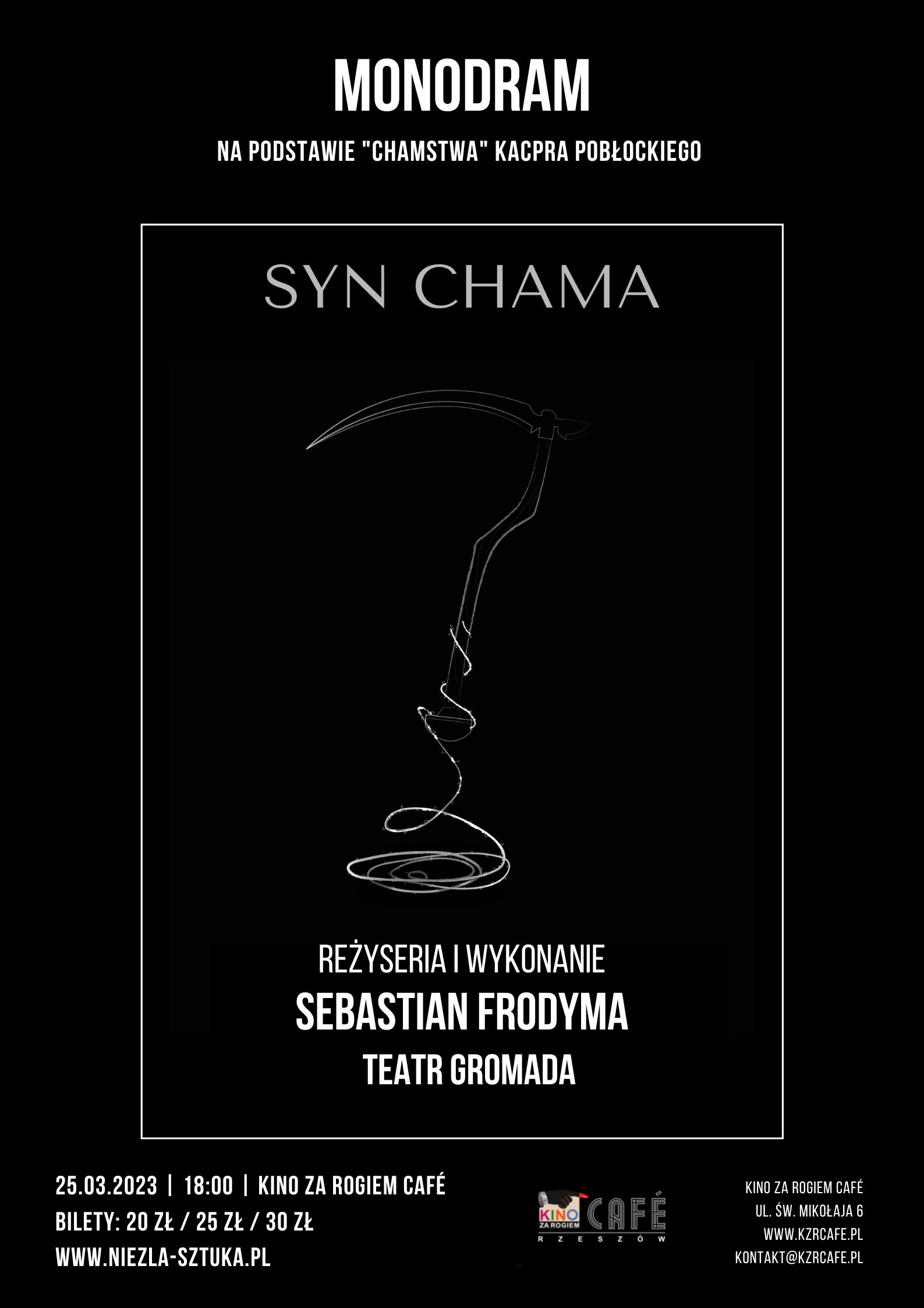 25.03 o godz. 18:00 Kino za Rogiem Cafe zaprasza na monodram Teatru Gromada „Syn Chama", w reżyserii i wykonaniu Sebastiana Frodymy, półfinalisty Mam Talent, artysty scenicznego i rzemieślnika kuglarskiego.