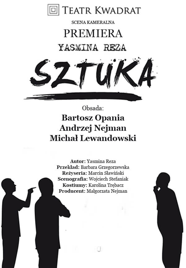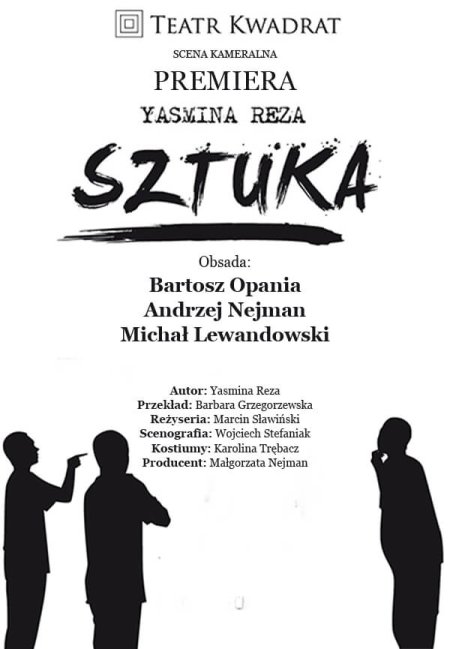 Prawdziwa męska przyjaźń przechodzi trudną próbę. Yvan się żeni, na szczęśliwe małżeństwo raczej się nie zanosi, za to Marc i Serge dosyć już mają wysłuchiwania opowieści na temat przygotowań do ślubu. Jednak to nie to jest prawdziwym zarzewiem konfliktu. Serge zakupił dzieło sztuki, za niebagatelną kwotę dwustu tysięcy franków. Marcowi obraz modnego artysty nie przypadł niestety do gustu. Nie dostrzega subtelności i kunsztu tego, jego zdaniem, beznadziejnego płótna. W momencie, w którym dosadnie wypowie swoją szczerą acz niepochlebną opinię, wieloletnia przyjaźń zawiśnie na włosku. De gustibus non est disputandum, jednak w tym przypadku padają nie tylko mocne słowa, ale też równie silne ciosy. Yasmina Reza (autorka m.in. „Boga mordu” - czyli filmowej "Rzezi") bezbłędnie rozpracowuje mechanizmy rządzące relacjami międzyludzkimi. Komediowość sytuacji polega tu, jak zwykle u tej autorki, na ich autentyczności. Warto, dzięki tej błyskotliwej komedii, dostrzec jakże śmieszni bywają mężczyźni, kiedy ich ego rozdyma błahą sprawę do gargantuicznych rozmiarów. Kolejna propozycja na Kameralnej Scenie Kwadratu to brawurowe kreacje aktorskie trzech panów: Andrzeja Nejmana w roli Serge’a, snobistycznego nabywcy dzieła sztuki, Michała Lewandowskiego, w roli wrażliwego Yvana, dla którego asertywność jest pojęciem całkowicie obcym oraz gościnnie występującego Bartosza Opani w roli Marca o bardzo wybuchowym charakterze. Aktorski dream team oraz świetnie napisana „Sztuka” to gwarancja doskonałej rozrywki.