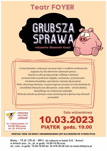 Spektakl "Grubsza sprawa" , to komedia z ciekawymi zwrotami akcji. Zawiera w sobie gorzką prawdę i refleksję o złudności ocenian ia ludzi na podstawie wyglądu, zachowania, przyzwyczajeń. Uwydatnia kompleksy i uprzedzeniai ukazuje siłę przyjaźni.