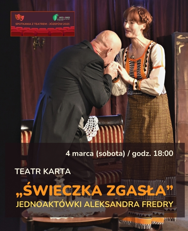 Teatr KARTA działa w Karczewieod lat 90-tych pod artystyczną opiekąaktorki Laury Łącz. Tym razem Teatr zaprezentuje urocze jednoaktówki Aleksandra Fredry pod wspólnym tytułem „Świeczka zgasła” zwłaściwym sobie humorem traktujące orelacjach damsko-męskich, które niewiele zmieniły się naprzestrzeni wieków, budząc uśmiech irefleksję także dziś.W sztuce grają: Beata Cisek, Małgorzata Kowalska, Barbara Różycka, Monika Wojciechowska, Grzegorz Sychowiec, Adrian Wojciechowski, Tomasz Wojciechowski, Arkadiusz Żelazko.