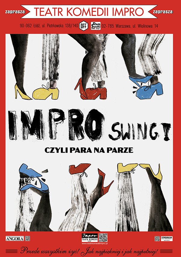 Jak kobiety widzą swoich partnerów, co im doskwiera, za czym tęsknią i co cenią, a czego nie potrafią znieść? Jak mężczyźni po latach oceniają swoje związki i samych siebie? Na te pytania postaramy się odpowiedzieć w najnowszym formacie Teatru Komedii Impro „IMPRO Swing!, czyli para na parze”. Wszystko zaczyna się od rozmowy z widzami, z której dowiemy się, co oznacza powiedzieć o kimś, że jest „uroczy” lub „urocza”, albo „zabawny” lub „zabawna”. Podpytamy publiczność i spróbujemy dowiedzieć się, jakie drobiazgi potrafią wywołać lub zażegnać największe nawet konflikty. Potem zajrzymy do… damskiej toalety, gdzie przed lustrem dwie kobiety porozmawiają szczerze o tym, co myślą o sobie, o świecie i - oczywiście - o mężczyznach. Na oczach widzów zbudują swoim partnerom historię i nadadzą rolę. A potem… niech się dzieje improwizacja.