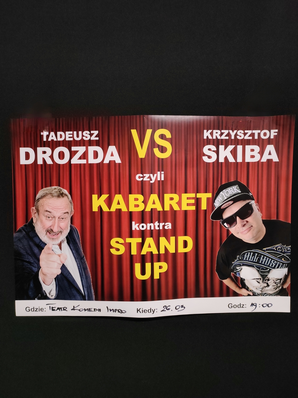 Widowisko komediowe "Kabaret kontra Stand-Up", czyli legenda kabaretu Tadeusz Drozda (lider kabaretu Elita, autor programów telewizyjnych "Śmiechu Warte", "Herbatka u Tadka" i "Dyżurny Satyryk Kraju") kontra stand-up, czyli Krzysztof Skiba (satyryk, autor tekstów zespołu Big Cyc, programy telewizyjne "Lalamido", "Uwaga Hotel", "Podróże z Żartem"). W tym trwającym dwie godziny spektaklu komediowym, widz będzie miał szanse być świadkiem konfrontacji scenicznej dwóch stylów komediowych. Pyszna zabawa, pełna żartów, aktualnych komentarzy i monologów komediowych, które rozbawią nawet najbardziej zatwardziałych ponuraków. Inteligentny humor dwóch wielkich osobowości polskiej estrady.