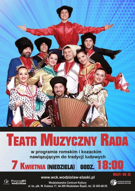 Teatr Muzyczny „Rada” powstał na Białorusi. Odbył wiele międzynarodowych tras koncertowych. Podczas występu w Wodzisławskim Centrum Kultury zespół zaprezentuje widzom dwa programy. Widowisko wokalno-choreograficzne „Kozacy”, na który składają się pełne pasji tańce i śpiewy odwołujące się do kozackich tradycji Białorusi, Rosji i Ukrainy. Najpopularniejsze utwory to „Valenka”, „Rozłóż konie chłopców” czy „Chernomorets”. Tego wieczoru publiczność zobaczy też program „Ogniska duszy cygańskiej”, podczas którego publiczność będzie miała okazję poczuć magię zawrotnych tańców i melodii, niosących w sobie wielką cygańską moc i wolność ducha. Znakomita choreografia, taniec i muzykas tworzą niezwykłe zjawisko, przenosząc widza w świat innych kultur.