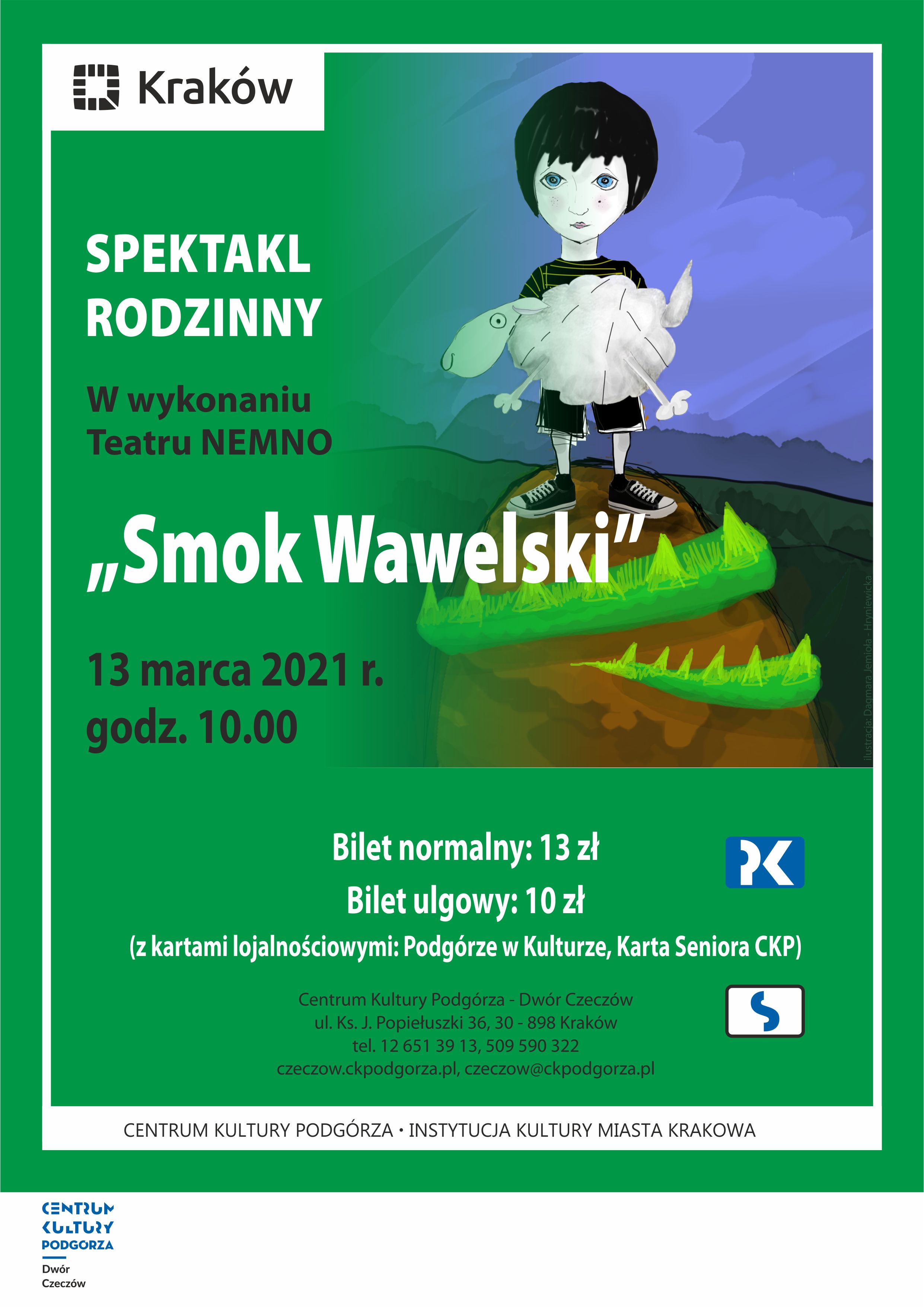 Zapraszamy na kolejny spektakl po długiej przerwie w naszej działalności z cyklu spektakli rodzinnych w Dworze Czeczów. 13 marca 2021 r. o godzinie 10:00 odbędzie się spektakl pt. "Smok Wawelski" w wykonaniu Teatru Nemno.
