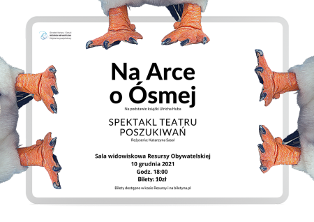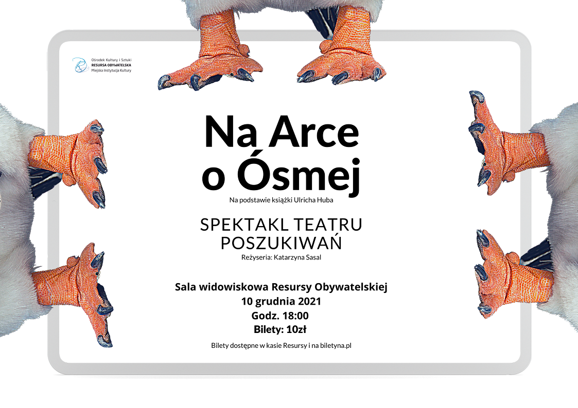 Spektakl „Na Arce o ósmej” na podstawie książki Ulricha Huba to humorystyczna przygoda trzech Pingwinów, które od Gołębia - posłańca Noego otrzymują bilety na Arkę. To dowcipna wariacja na temat znanej opowieści biblijnej. Spektakl jest uroczą i przewrotną historią, w której pojawiają się pytania dotyczące wiary w Boga, potęgi przyjaźni czy walki dobra ze złem. Żartobliwy tekst i wartka akcja przeznaczona jest dla widza od 8 roku życia i dorosłych.