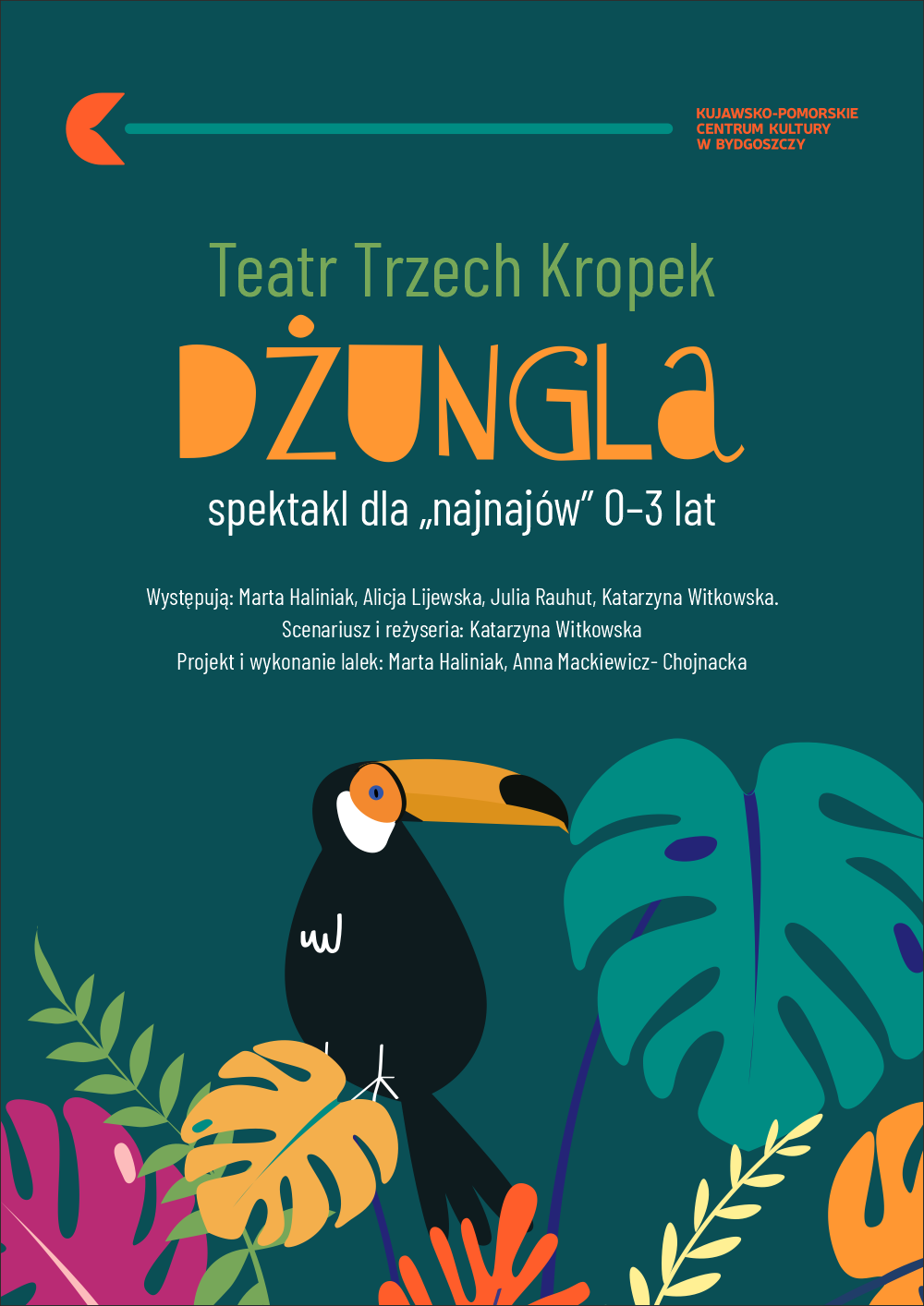 Spektakl „Dżungla” to kolejna podróż sensoryczna Teatru Trzech Kropek działającego przy Kujawsko-Pomorskim Centrum Kultury w Bydgoszczy. Pośród dzikiej roślinności dżungli zaklęta jest niezwykła magia. Otaczające dźwięki zielonej puszczy, różnorodne faktury i barwy zapraszają maluchy do beztroskiego odkrywania.
