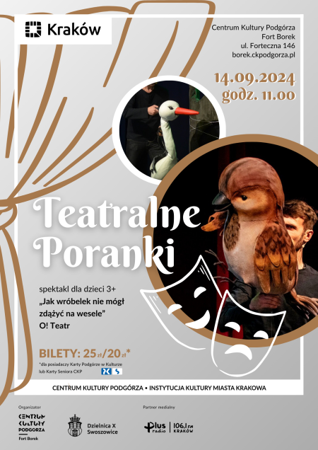 Teatralne Poranki w Forcie Borek to weekendowe spotkania dla najmłodszych z teatrem. 14 września 2024 o godzinie 11:00 na scenie zagości O! Teatr ze spektaklem „Jak wróbelek nie mógł zdążyć na wesele”.