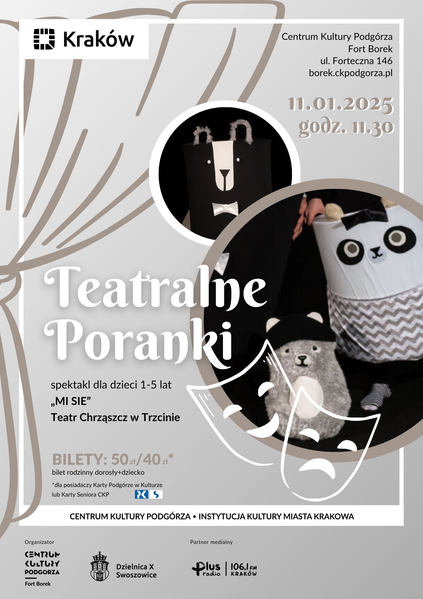 Teatralne Poranki w Forcie Borek to weekendowe spotkania dla najmłodszych z teatrem. 11 stycznia 2025 o godzinie 11:30 na scenie zagości Teatr Chrząszcz w Trzcinie ze spektaklem „MI SIE”.