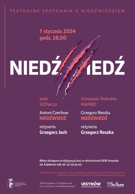 Magiczna podróż w czasie, którą rozpocznie Teatr Scena 22 prezentując "Niedźwiedzia" Antoniego Czechowa w reżyserii Grzegorza Jacha, a zakończy "Niedźwiedź" Kompanii Teatralnej MAMRO wg tekstu i reżyserii Grzegorza Reszki.