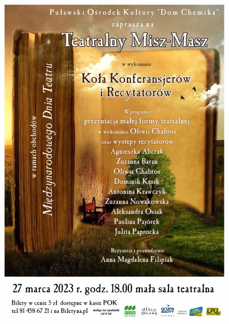 Przed nami szósta edycja spotkań z poezją w wykonaniu adeptów sztuki żywego słowa z Koła Konferansjerów i Recytatorów, czyli Teatralny Misz-Masz. Okazją do spędzenia popołudnia ze słowem pisanym będą coroczne obchody Międzynarodowego Dnia Teatru.