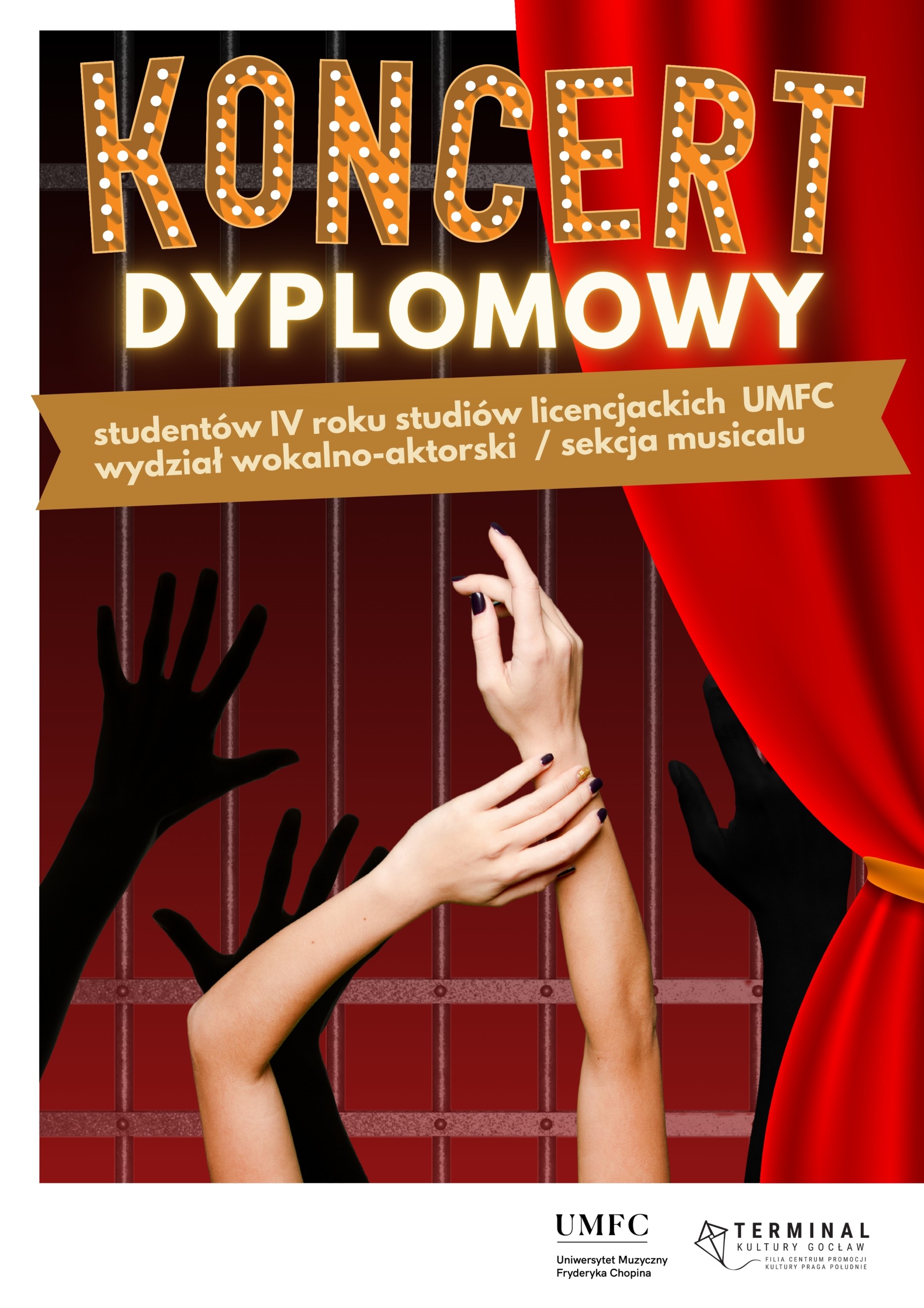 Studenci sekcji musicalowej Wydziału Wokalno-Aktorskiego Uniwersytetu Muzycznego Fryderyka Chopina serdecznie zapraszają na swój koncert dyplomowy. W programie mniej i bardziej znane songi musicalowe oraz wybrane sceny m.in. z musicalu pt. Chicago.
