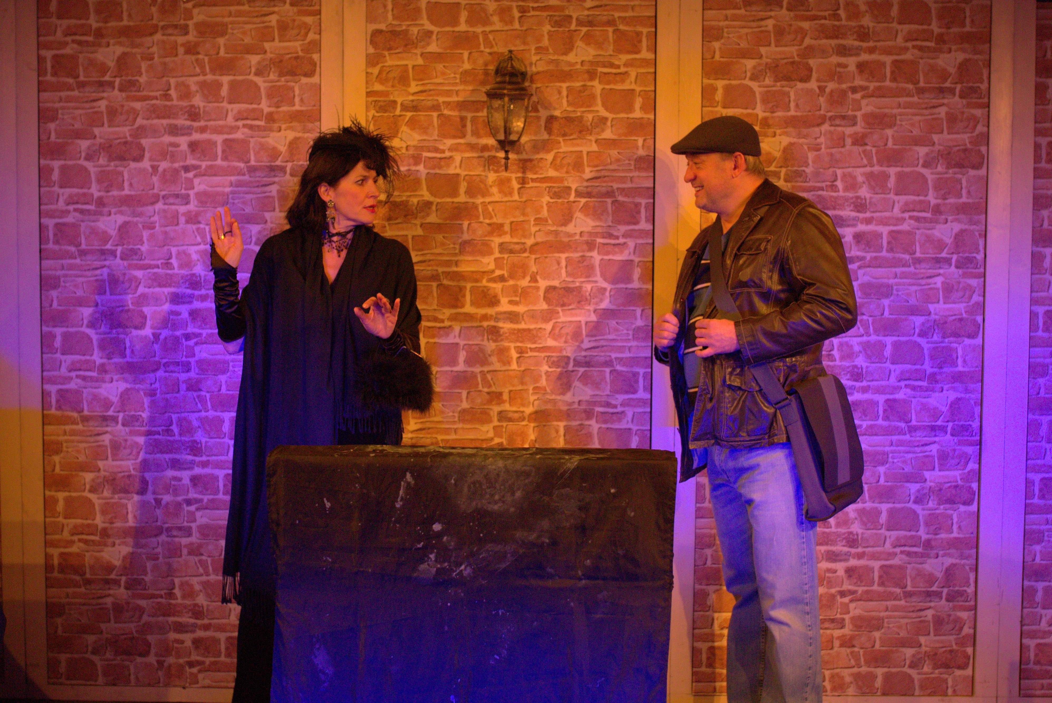 VIAGRA i CHRYZANTEMY - spektakl, który w komediowy sposób opowiada o różnicach społecznych, niespełnionych marzeniach i miłości aż po grób. Ona, dystyngowana wdowa i niespełniona zawodowo śpiewaczka operowa, szuka ukojenia w rozmowach ze swoim zmarłym mężem, nad jego grobem. On, nieokrzesany, pragmatyczny rzemieślnik w branży kamieniarskiej, dobrze prowadzący swoje interesy, wydawać by się mogło, jest osobą spełnioną, tak zawodowo, jak i prywatnie. Dług finansowy i błąd ortograficzny, to początek konfliktu burzliwej znajomości. Czy cmentarne kwiaty i leki na potencję mogą w czymś pomóc? Ona nawet zaliczki mu nie dała, a On narobił jej bigosu. Od miłości do nienawiści i od nienawiści do miłości, jest krótka droga. A jak będzie tym razem?