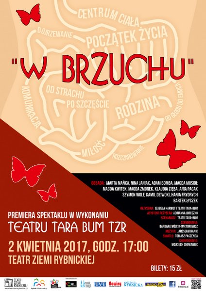 Premiera spektaklu Teatru Tara Bum TZR pt. "W brzuchu". Brzuch jest centrum ciała, od którego wszystko się zaczyna. Dziecko, fizjologia, motyle, stres, emocje. Bez niego nie jesteśmy w stanie przetrwać, on nami kieruje. Brzuch - miejsce w którym wszystko (lub bardzo wiele) się mieści. O tym co w brzuchu piszczy możecie się przekonać odwiedzając Tara-Bum w Teatrze Ziemi Rybnickiej.