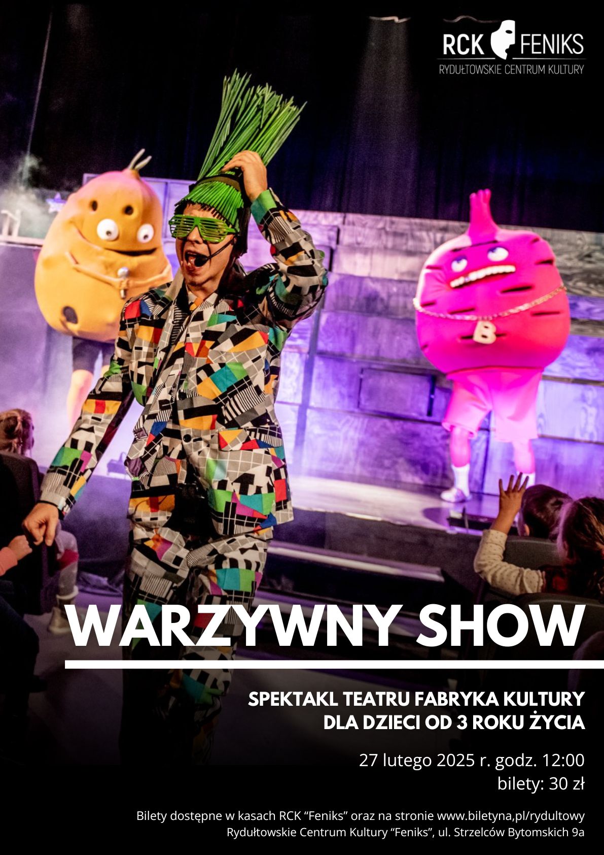 Spektakl “Warzywny Show” odbędzie się 27 lutego 2025 roku o godzinie 12:00 w sali teatralnej Rydułtowskiego Centrum Kultury “Feniks”, ul. Strzelców Bytomskich 9a. Bilety w cenie 30 zł dostępne są w kasach RCK oraz na stronie www.biletyna.pl/rydultowy.