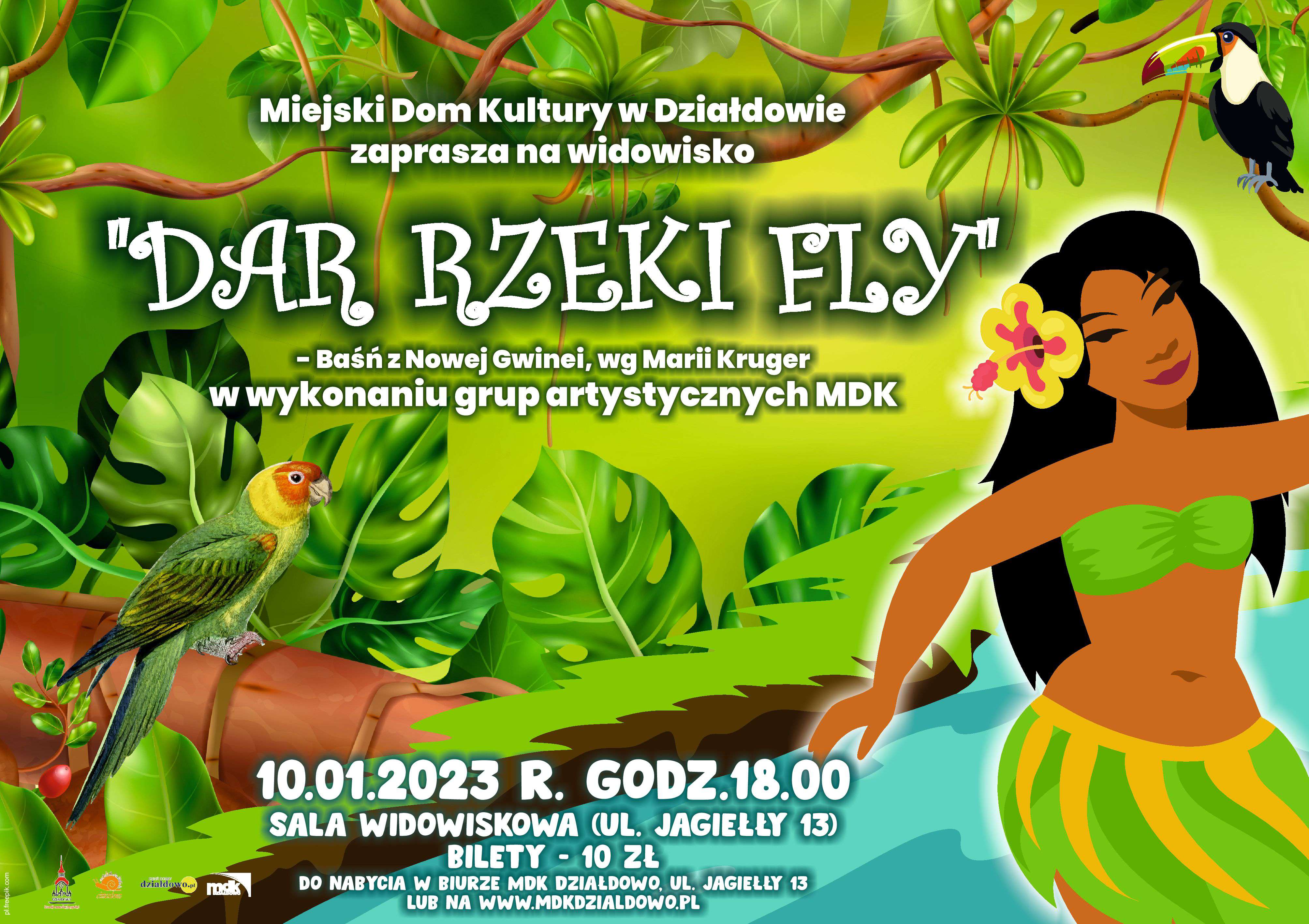 Widowisko odbędzie się 10 stycznia 2023 r., o godz. 18.00 w sala widowiskowej MDK ul. Jagiełły 13. Bilety - 10 z do nabycia w biurze MDK Działdowo, ul. Jagiełły 13 lub na www.mdkdzialdowo.pl. Sprzedaż biletów rusza 1 stycznia. Zapraszamy.