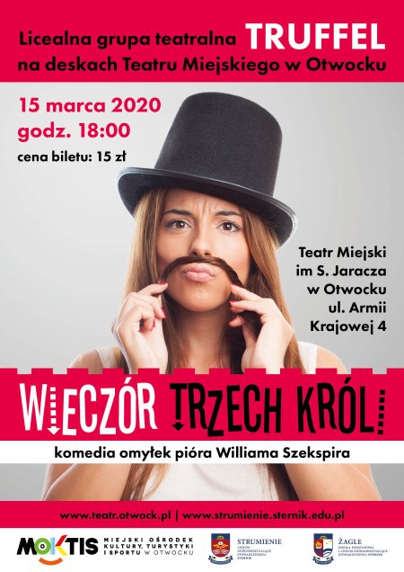 Grupa TRUFFEL, czyli miłośnicy teatru z podwarszawskich liceów "Strumienie" i "Żagle", zaprasza na adaptację znanej komedii omyłek Wiliama Szekspira pt. "Wieczór trzech króli".