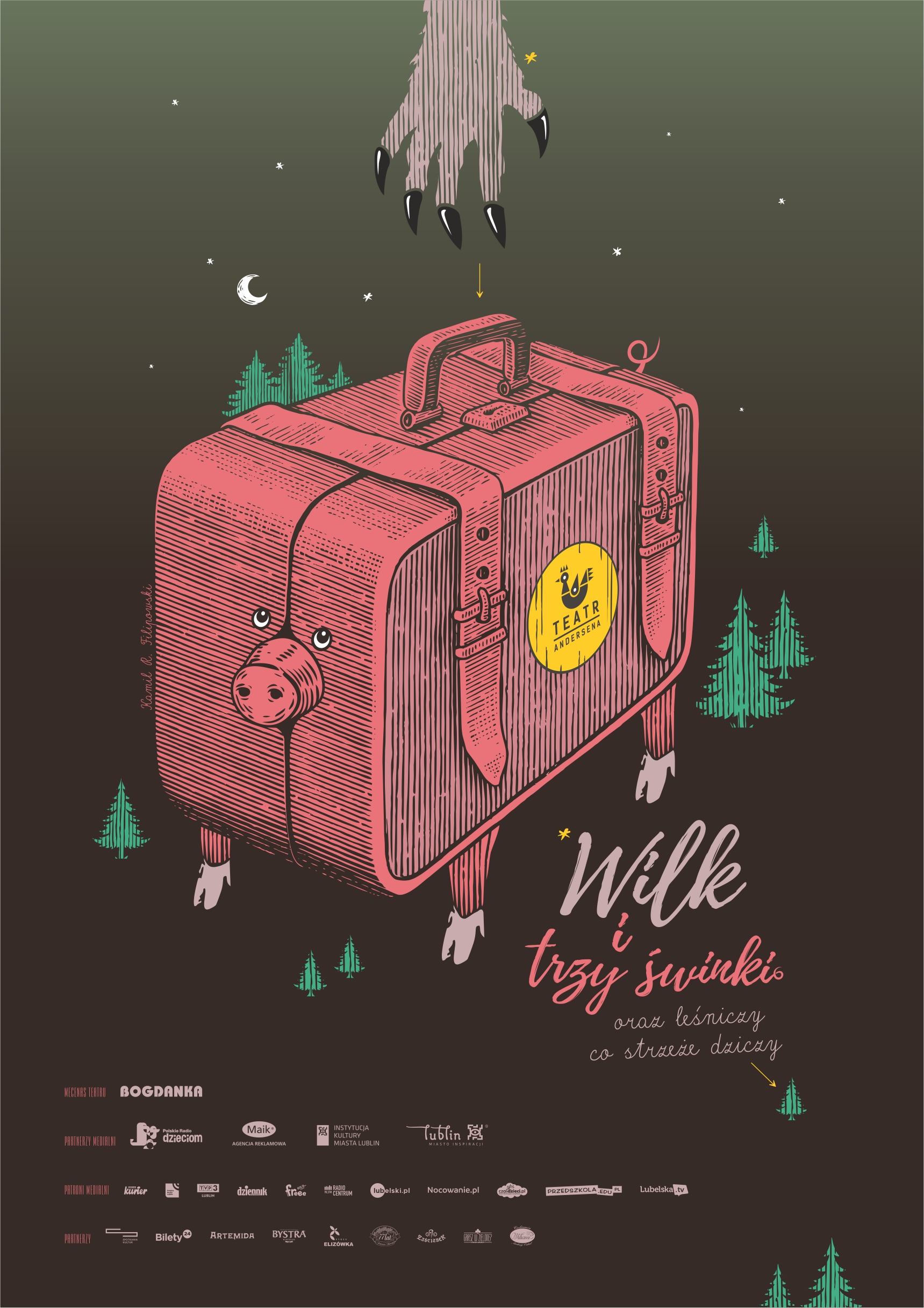 Zapewne wszyscy znamy baśń braci Grimm o wilku i trzech świnkach. Porywający spektakl lalkowy aktorów lubelskiego Teatru Andersena jest wariacją na temat dalszych losów bohaterów tej baśni. W błyskotliwy i zabawny sposób opowiada, co mogło stać się z wilkiem po jego tajemniczym zniknięciu, korzystając przy tym z klasycznych baśni braci Grimm. Spektakl dotyka tematyki stereotypów i lęków przed nieznanym, a także rzuca wyzwanie tak częstej dziś niechęci do zrozumienia drugiej osoby, jej wyborów czy kultury. Widz będzie miał okazję zobaczyć aż cztery rodzaje lalek teatralnych oraz kolorowy teatr cieni – z muzyką na żywo! Ten spektakl to wspaniała rozrywka dla całej rodziny, która pozwala zakochać się w prawdziwym teatrze lalek.