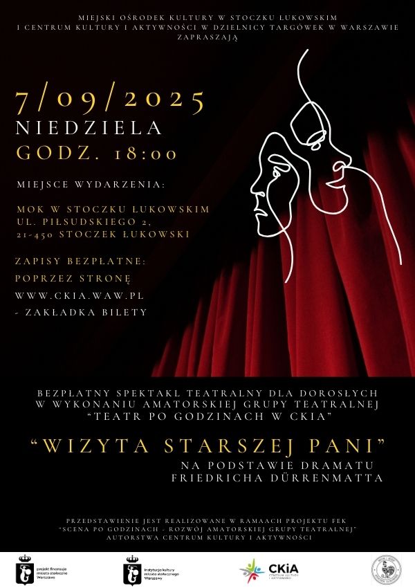 📅 7 września 2025 (niedziela) o godz. 18:00 do Miejskiego Ośrodka Kultury w Stoczku Łukowskim, ul. Piłsudskiego 2, 21-450 Stoczek Łukowski, na bezpłatny spektakl teatralny na podstawie dramatu Friedricha Dürrenmatta pt. „Wizyta starszej pani” w wykonaniu grupy Teatr po godzinach - artystów-amatorów, którzy od lat dojrzewają twórczo pod skrzydłami Centrum Kultury i Aktywności w Dzielnicy Targówek m.st. Warszawa.
