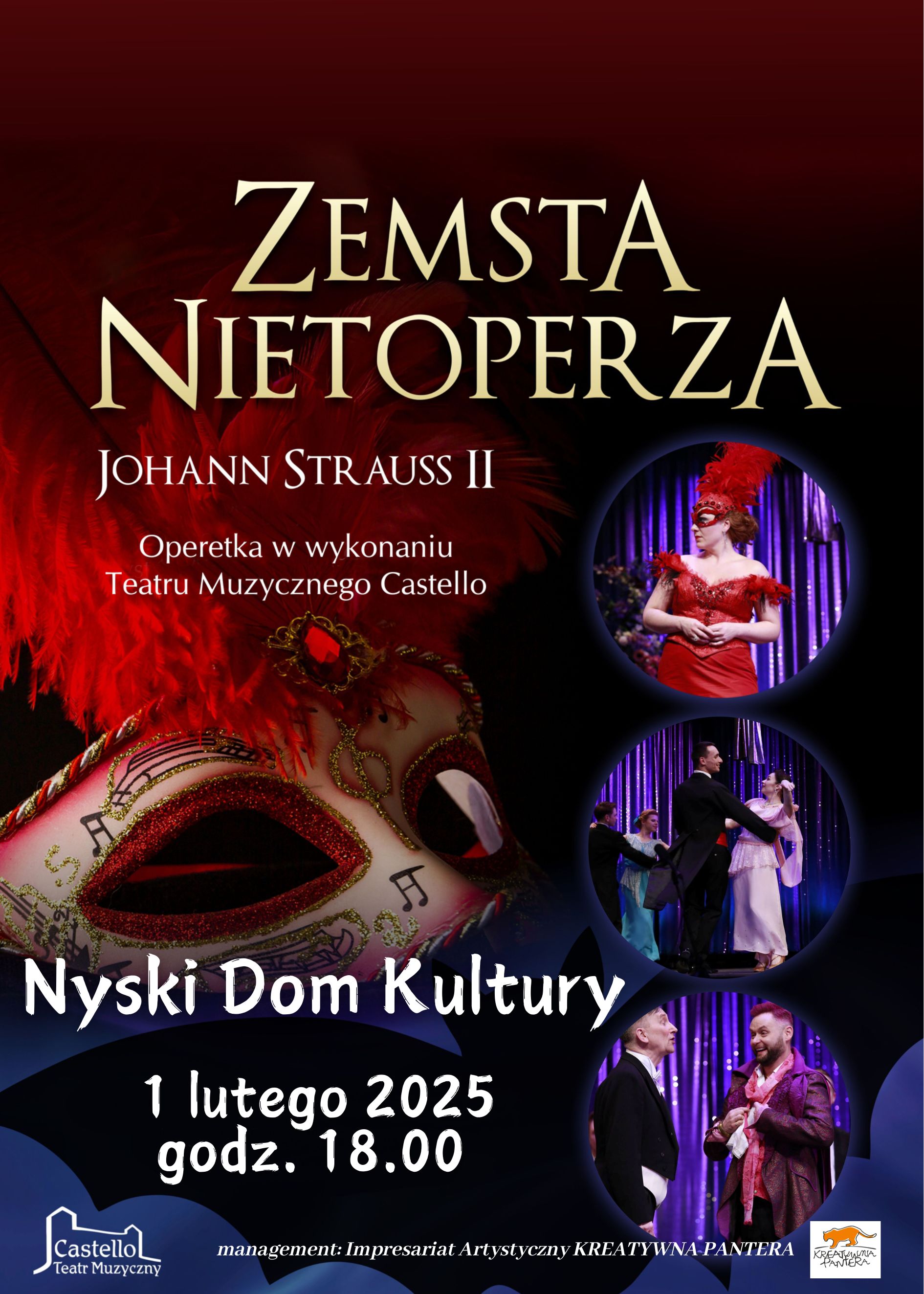 Arcydzieło gatunku! W tej operetce zdarzyć się może absolutnie wszystko. Przebrana za swoją panią sprytna pokojówka zostanie gwiazdą na balu u Księcia Orlovskiego, Dr. Falkę urządzi pyszną zemstę swojemu przyjacielowi za urządzony mu w przeszłości niewybredny kawał. Temperamentna Rozalinda pod maską karnawałową tropić będzie niewiernego męża, który zamiast odsiadywać karę w więzieniu, wyląduje na szampańskim balu u Orlovskiego. Fabuła eksploduje intrygami i przygodami bohaterów. Zdrady małżeńskie, występki i wreszcie spektakularny akt zemsty przeplatają się z szampańską zabawą, w porywającym akompaniamencie walców giganta operetki wiedeńskiej, J. Straussa II. Spektakl przygotowany przez solistów, balet oraz muzyków Teatru Muzycznego Castello.