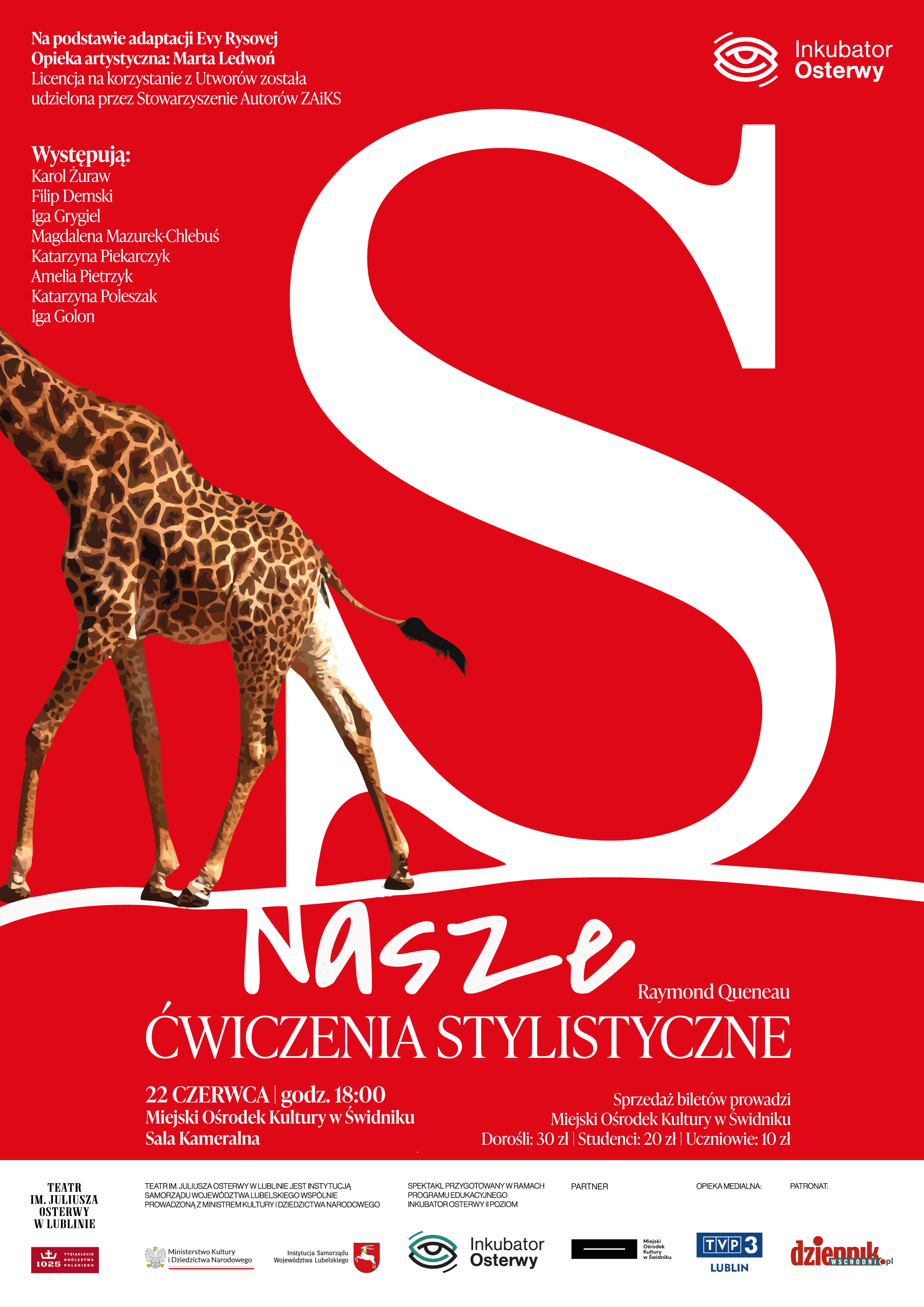 serdecznie zapraszamy Państwa do udziału w wyjątkowym spektaklu „Nasze ćwiczenia stylistyczne”, zrealizowanego przez grupę teatralną w ramach programu Inkubator Osterwy. Z radością chcemy zaprezentować efekt ich pracy warsztatowej oraz kreatywność i zaangażowanie, które włożyli w wielotygodniowe próby i przygotowania. To innowacyjny program, który pozwala osobom z poza teatru odkryć magię teatru i zdobywać cenne doświadczenie sceniczne. Będzie nam niezmiernie miło, jeśli zechcą Państwo wesprzeć artystów swoją obecnością i razem z nami przeżyją to wyjątkowe wydarzenie.