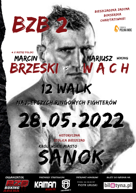 Druga gala boksu pod szyldem BZB czyli Bieszczadzkiej Zadymy Bokserskiej to gwarantowane bokserskie emocje na najwyższym poziomie! 12 bardzo mocnych i wyselekcjonowanych walk, w których zmierzą się najlepsi ringowi fighterzy! Wśród nich m.in. Mistrzowie Polski, Reprezentanci Polski oraz zawodnicy znani z najbardziej zaciętych walk poprzedniej edycji! Zwieńczeniem będzie walka wieczoru, w której wyzwanie Marcina Brzeskiego (4 krotnego mistrza Polski w boksie), przyjął sam Mariusz Wiking Wach!!! Mamy zatem jedną z najmocniejszych kart walk w boksie w tym roku jaką zobaczymy w Naszym Kraju! Jesteście głodni emocji? Na gali, prócz doskonałych zawodników zobaczymy wielu zaproszonych celebrytów i artystów. Będzie można wylicytować gadżety niedostępne nigdzie indziej, a swoim podopiecznym będzie przyglądać się czołówka polskich trenerów na czele ze znanym już chyba wszystkim kibicom boksu - trenerem Zbigniewem Raubo! Zapraszamy wszystkich do stolików VIP i na trybuny! Gala ma charakter charytatywny. Będąc na niej wspólnie pomagamy potrzebującym!