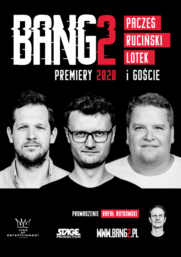 Rafał Pacześ, Łukasz "Lotek" Lodkowski oraz Kacper Ruciński w trasie, której jeszcze nie było. 3 ARMATY POLSKIEGO STAND-UPU. Odpali je po kolei na scenie prowadzący to wydarzenie Rafał Rutkowski ! Tylko premierowe programy, napisane specjalnie na tę okazję, które będziecie mogli zobaczyć po raz pierwszy w życiu i tylko tutaj. Największe hale w Polsce. Sto tysięcy biletów. Plus Goście. Gotowi na BANG 2?