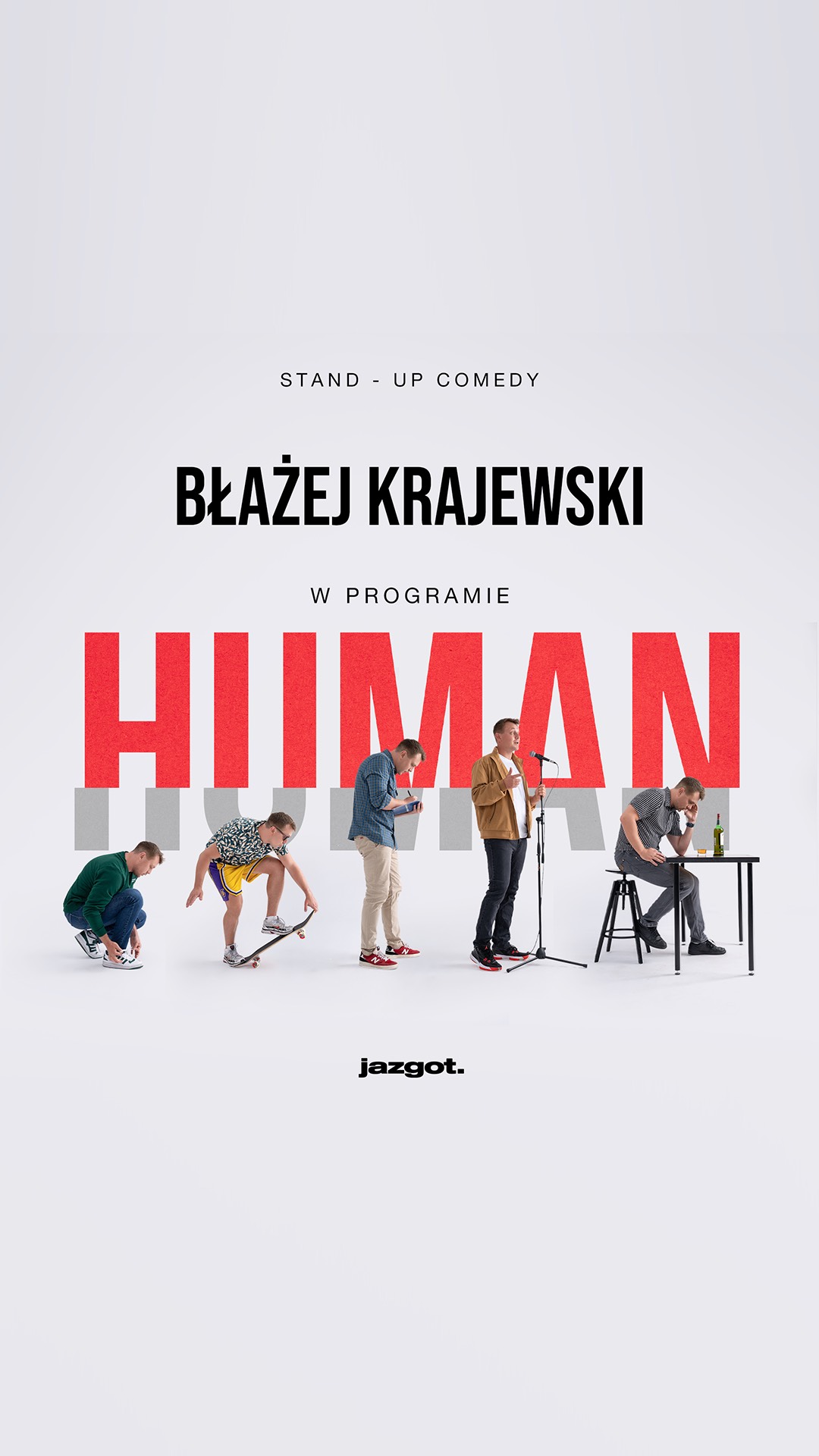 "Human" to nowy program Błażeja Krajewskiego, w którym komik z dystansem i humorem przygląda się temu, co nas wyróżnia jako ludzi. Nie zabraknie kultowych imitacji celebrytów i zabawnych obserwacji z życia codziennego. Jakie mamy słabości? Co nas śmieszy? Sprawdź na żywo i zobacz, czym dla Błażeja jest bycie "humanem".