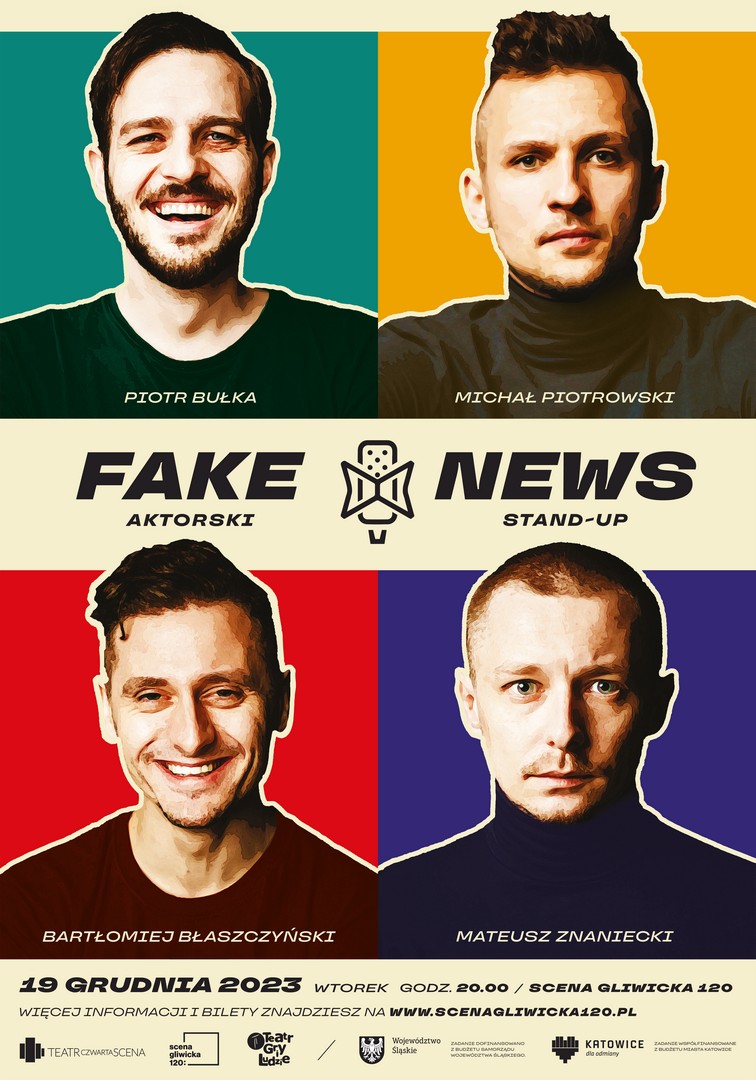 „Fake News” to aktorski stand-up, drapieżny komentarz do współczesności rozpisany na cztery głosy. Gdzie jest granica między prawdą i fejkiem? Czy bardziej interesujące jest to, co się nie wydarzyło? Który job jest bardziej upokarzający: różowy pączek wielkości człowieka, czy śpiewanie do kotleta jako Piotr Kupicha? Jak tłumaczy się człowiek, który jadąc nago autem wiezie przypiętego pasami łabędzia i ukradzione dwadzieścia jeden kur? Ile spektakli o Wojciechu Korfantym powstało w ostatnich pięciu latach?