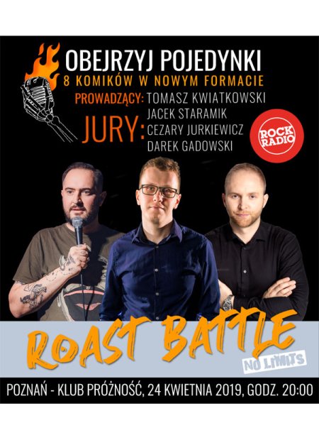 Wydarzenie nietypowe, podczas którego odbędą się pojedynki w formie roastu oceniane przez Jury. Zwycięzca każdej bitwy przechodzi dalej, by zdobyć rękawice najlepszego w lidze Roast Battle No Limits w danym sezonie. Finał zmagań odbędzie się na Polskim Festiwalu Stand-upu w sierpniu. Zapraszamy miłośników "ostrych żartów" i bystrych panczlajnów!