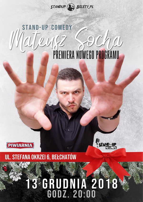 Mateusz Socha - człowiek, który zrobił coś szalonego. Mimo krótkiego, zaledwie dwuletniego doświadczenia na scenie, Mateuszowi udało się dotrzeć do bardzo szerokiego grona odbiorców. Sukces odniósł nie bez powodu - charyzma i zaraźliwy śmiech zjednują mu publikę. Na scenie zobaczycie człowieka, który wyspecjalizował się w tworzeniu wielowątkowych historii, które podzielone są bardzo licznymi, coraz głębszymi dygresjami. Nie obawiajcie się jednak zaginięcia, po to macie Matiego, żeby Mati Was przez te opowieści przeprowadził.