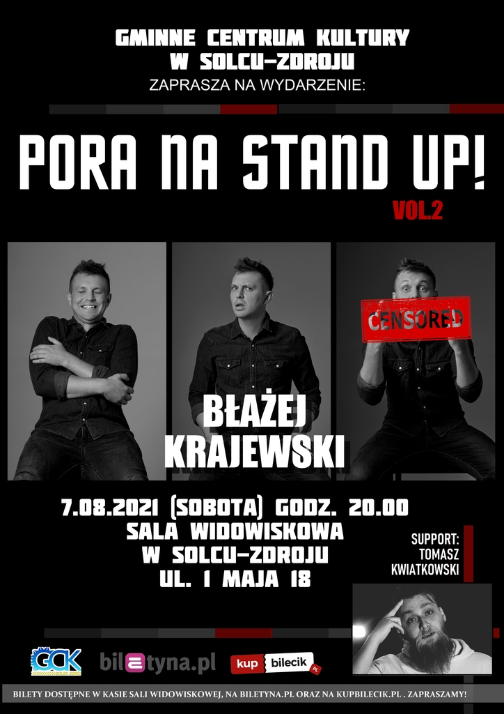 Mili mieszkańcy Solca-Zdroju, po pierwszej udanej edycji, wracamy do was z jeszcze mocniejszą dawką stand-up'u. Myślę, że bardzo, ale to bardzo ucieszy fanów komedii wiadomość, że na drugim wydarzeniu z cyklu "Pora na stand-up" wystąpi nikt inny jak Błażej Krajewski, który po lockdownie powraca ze swoim najnowszym programem "Rzut za dwa"! Bydgoski komik znany z opowiadania historii z rodzinnego miasta, wielu wpadek, które Błażej przyciąga do siebie jak magnes oraz wcieleniami w barwne postacie zaczerpnięte ze świata popkultury.